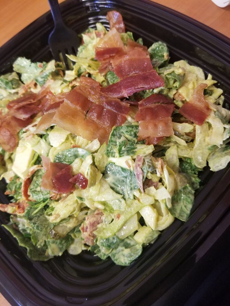 Savory hickory smoked bacon. Crisp lettuce. Ripe tomatoes. All mixed with Spinach, crunchy cucumbers, sweet green peppers, black olives, and zesty red onions.